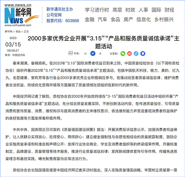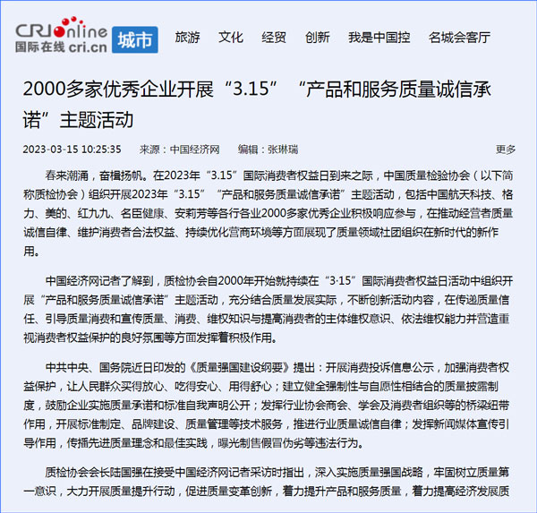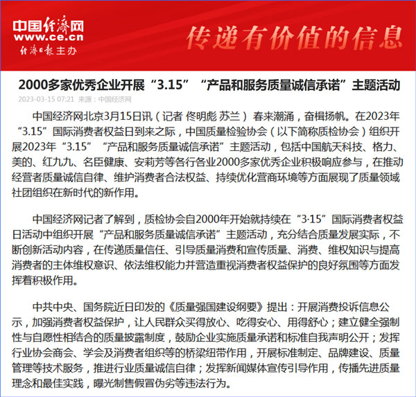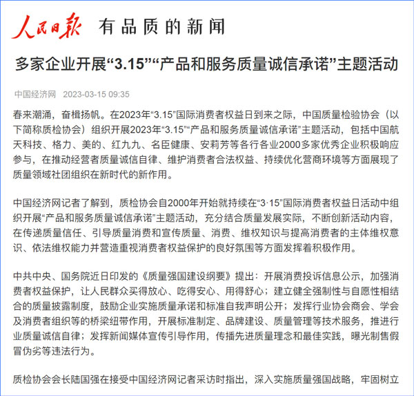 中國質(zhì)量報(bào):凝心聚力譜寫引導(dǎo)質(zhì)量消費(fèi)新篇章——中國質(zhì)檢協(xié)會組織兩千多家企業(yè)開展“產(chǎn)品和服務(wù)質(zhì)量誠信承諾”主題活動