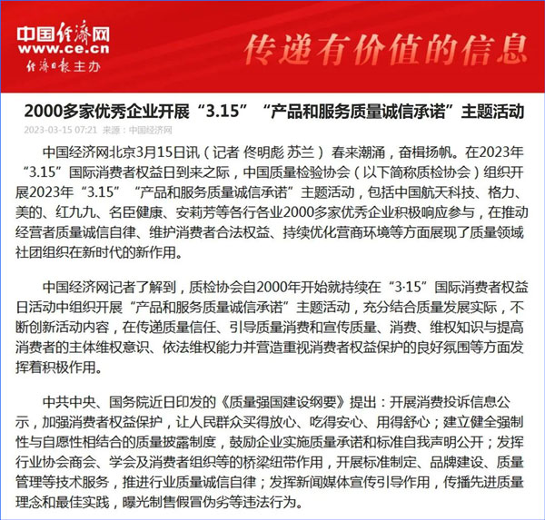 中國(guó)經(jīng)濟(jì)網(wǎng):2000多家優(yōu)秀企業(yè)開(kāi)展“3·15”“產(chǎn)品和服務(wù)質(zhì)量誠(chéng)信承諾”主題活動(dòng)