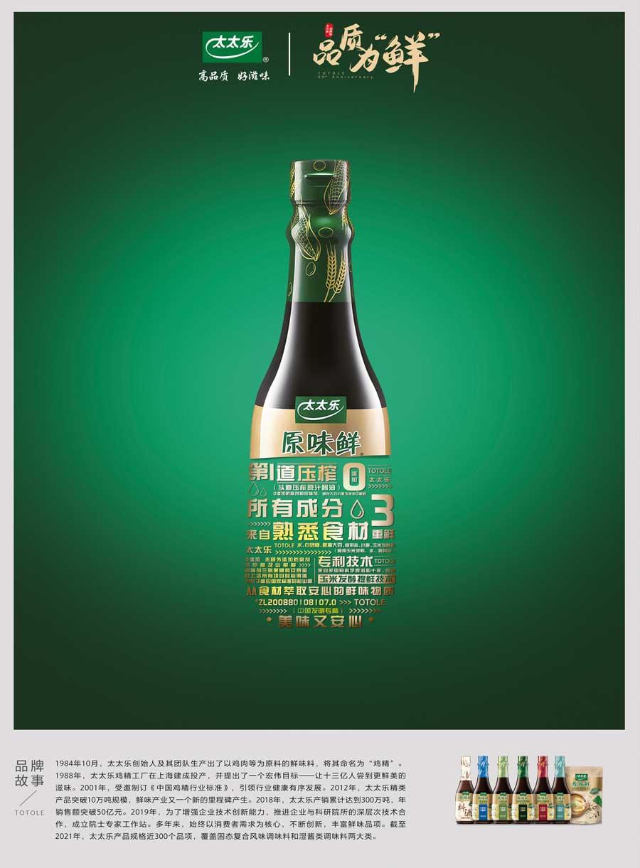 太太樂(lè)產(chǎn)品覆蓋固態(tài)復(fù)合風(fēng)味調(diào)味料和液態(tài)增鮮調(diào)味料兩大類的不同系列,多個(gè)子品牌,產(chǎn)品規(guī)格近300個(gè)品項(xiàng)。太太樂(lè)憑借雀巢體系的國(guó)際化管理體制、全球化質(zhì)量監(jiān)管體系、強(qiáng)大的研發(fā)實(shí)力和卓越的員工團(tuán)隊(duì),依托以餐飲、零售、電商、出口為主的四大銷(xiāo)售渠道,銷(xiāo)售網(wǎng)絡(luò)覆蓋全國(guó)各地,并出口至美國(guó)、加拿大、日本、中東等國(guó)家和地區(qū)。作為鮮味科學(xué)倡導(dǎo)者,太太樂(lè)以“讓十三億人嘗到更鮮美的滋味”為企業(yè)使命,持續(xù)鮮味行業(yè)革新升級(jí)。