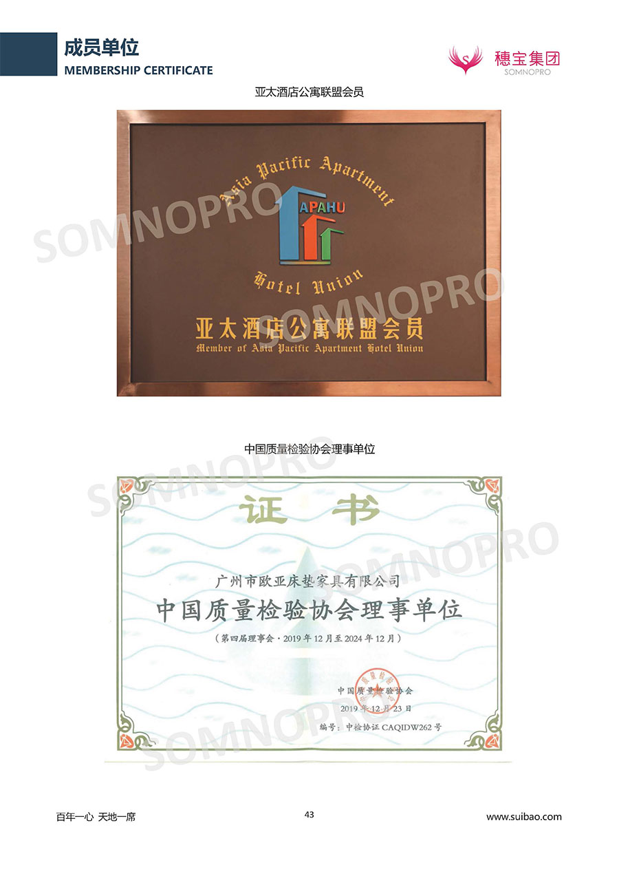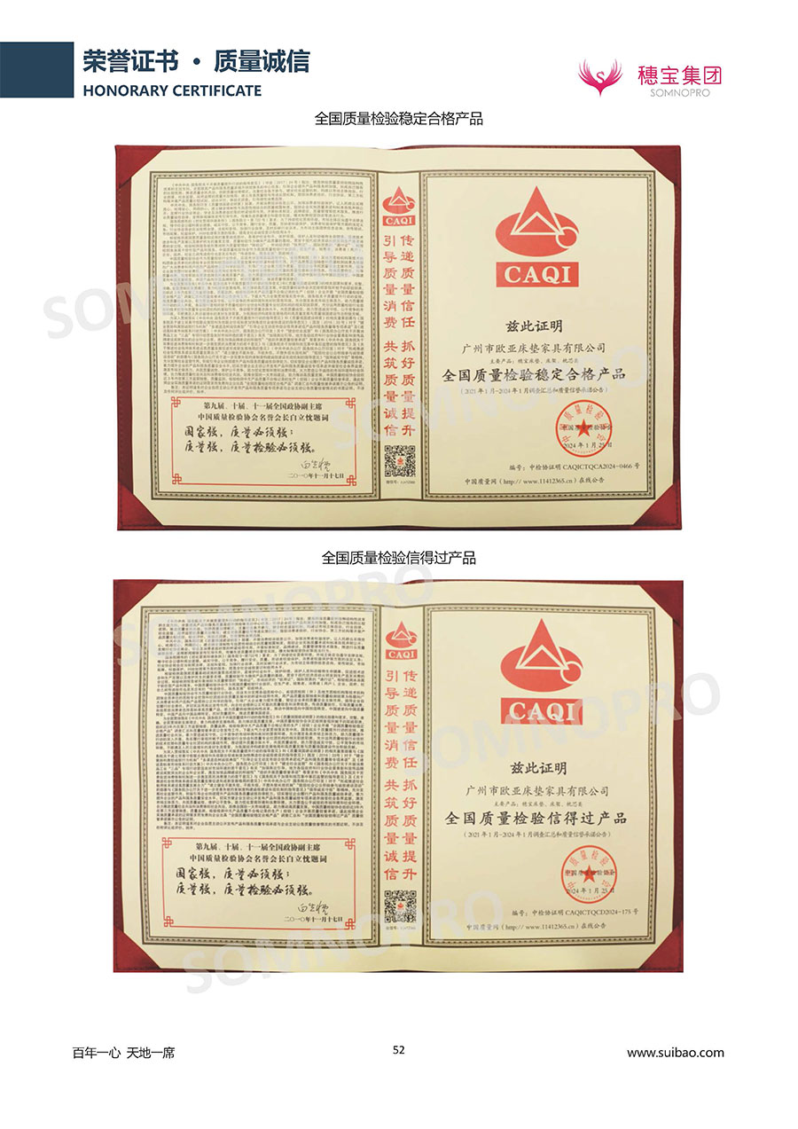 本著高品質(zhì)、高效率、重管理的原則,穗寶已通過ISO9001質(zhì)量管理體系認(rèn)證證書、ISO14001環(huán)境管理體系認(rèn)證證書、ISO45001職業(yè)健康安全管理體系認(rèn)證證書、中國環(huán)境標(biāo)志產(chǎn)品認(rèn)證證書、家居綠色環(huán)保領(lǐng)跑品牌、綠色正品家居品牌、企業(yè)標(biāo)準(zhǔn)“綠色領(lǐng)跑者”證書、CMS測量管理體系證書、CMS測量管理體系證書附件、廣東省“守信用重合同”企業(yè)、廣州歐亞-納稅信用A級納稅人(連續(xù)5年:2018-2022)、2024年中國500最具價值品牌,品牌價值高達(dá)302.89億元、廣東高價值商標(biāo)品牌(穗寶)、廣東省重點商標(biāo)保護(hù)名錄納入證明、廣州市勞動關(guān)系和諧企業(yè)AA級。穗寶自創(chuàng)立以來,不斷致力于新產(chǎn)品的設(shè)計與研發(fā),多次在國內(nèi)家具展會屢獲獎項,產(chǎn)品暢銷國內(nèi)外,深受客戶一致好評。