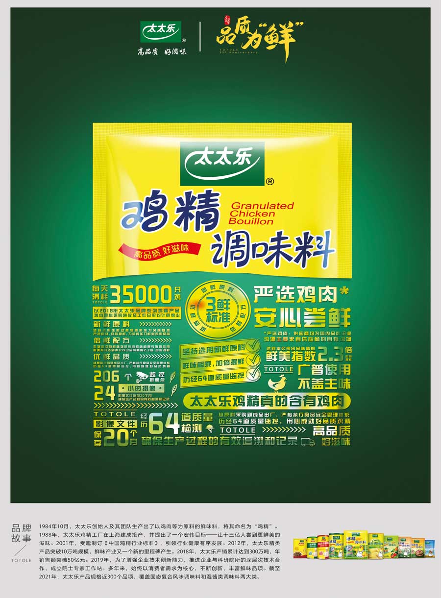 太太樂產(chǎn)品覆蓋固態(tài)復(fù)合風(fēng)味調(diào)味料和液態(tài)增鮮調(diào)味料兩大類的不同系列,多個子品牌,產(chǎn)品規(guī)格近300個品項。太太樂憑借雀巢體系的國際化管理體制、全球化質(zhì)量監(jiān)管體系、強大的研發(fā)實力和卓越的員工團隊,依托以餐飲、零售、電商、出口為主的四大銷售渠道,銷售網(wǎng)絡(luò)覆蓋全國各地,并出口至美國、加拿大、日本、中東等國家和地區(qū)。作為鮮味科學(xué)倡導(dǎo)者,太太樂以“讓十三億人嘗到更鮮美的滋味”為企業(yè)愿景,持續(xù)鮮味行業(yè)革新升級。