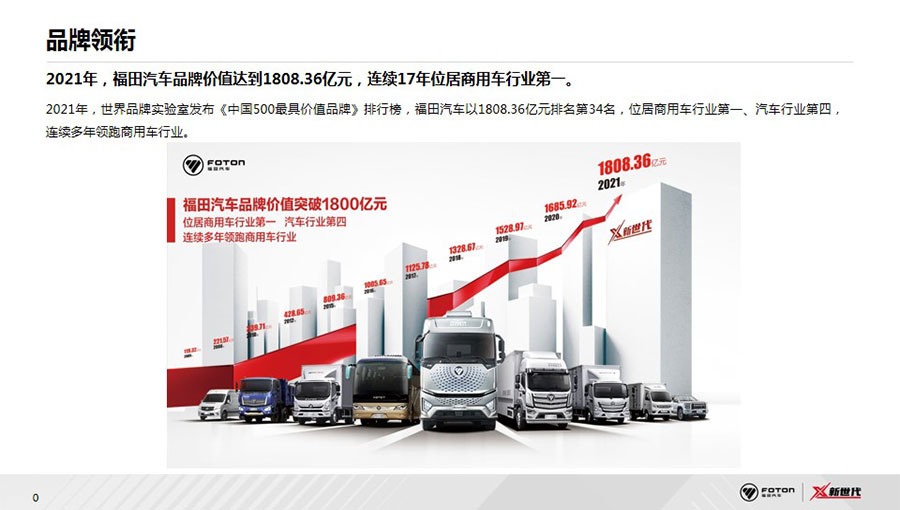 北汽福田汽車股份有限公司(簡稱福田汽車)成立于1996年,1998年在上海證券交易所上市,是中國品種最全、規(guī)模最大的商用車企業(yè)之一,2021年品牌價(jià)值達(dá)1808.36億元,連續(xù)16年蟬聯(lián)中國商用車行業(yè)第一位。2021年,在福田汽車成立的第25周年,總銷量突破1000萬輛,成為中國汽車工業(yè)史上首個(gè)銷量突破千萬輛的商用車企、中國首個(gè)千萬級(jí)“雙自主”商用車企、全球突破千萬銷量用時(shí)最短的商用車企。海外累計(jì)出口65萬輛,連續(xù)10年位居中國商用車出口第一,產(chǎn)品覆蓋全球110個(gè)國家和地區(qū)。