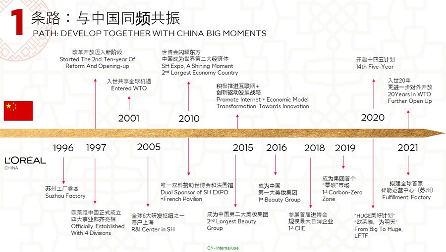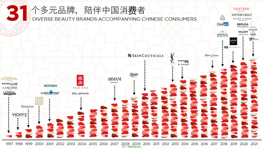 歐萊雅在1997年進(jìn)入中國(guó)。歐萊雅中國(guó)的總部位于上海,并在全國(guó)設(shè)有五個(gè)辦事處,目前在中國(guó)擁有31個(gè)品牌,一個(gè)研發(fā)和創(chuàng)新中心,兩家工廠分別位于蘇州和宜昌,共有超過(guò)14,000名員工。經(jīng)過(guò)25年高質(zhì)量、穩(wěn)健、可持續(xù)的增長(zhǎng),中國(guó)已成為歐萊雅集團(tuán)全球第二大市場(chǎng),該集團(tuán)北亞區(qū)美妝黃金三角洲的總部,以及該集團(tuán)美妝科技三大樞紐之一。作為中國(guó)最佳企業(yè)公民之一,歐萊雅中國(guó)始終貫徹落實(shí)該集團(tuán)提出的“歐萊雅,為明天——可持續(xù)發(fā)展承諾2030”,是該集團(tuán)第1個(gè)完整運(yùn)營(yíng)設(shè)施“零碳”的市場(chǎng),并積極通過(guò)社會(huì)責(zé)任項(xiàng)目,持續(xù)貢獻(xiàn)中國(guó)社會(huì)的美好發(fā)展。