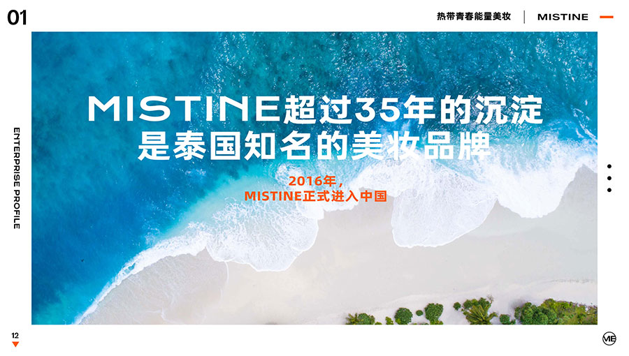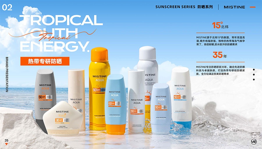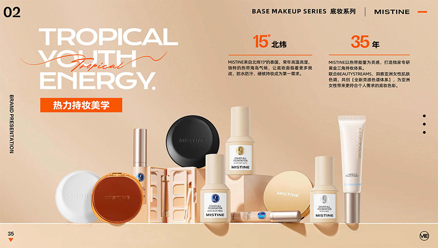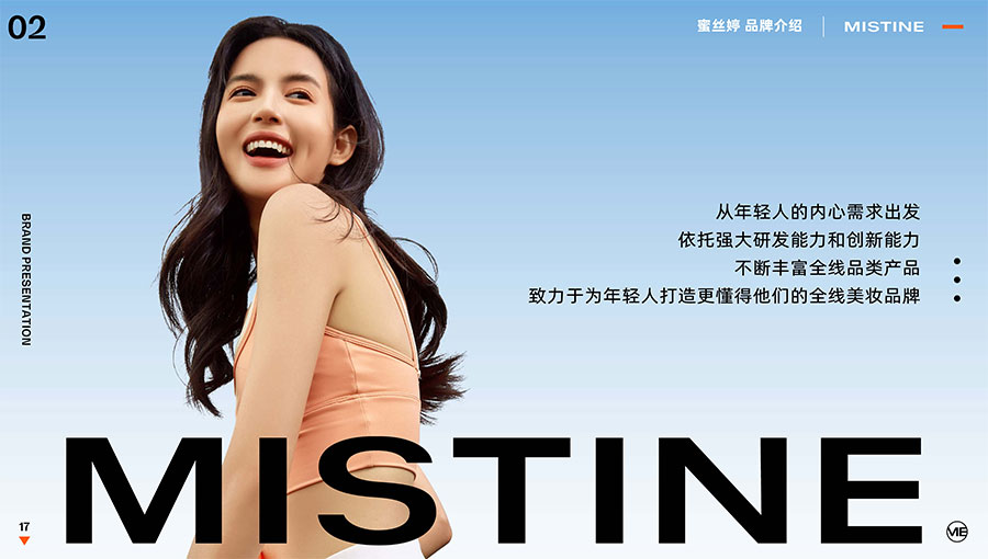 MISTINE蜜絲婷1988年始源于泰國(guó),作為知名國(guó)際美妝品牌,擁有超過(guò)35年的科研底蘊(yùn),產(chǎn)品種類涵蓋防曬、美妝、護(hù)膚、香水、個(gè)護(hù)五大類,擁有近6000多個(gè)單品暢銷全球20多個(gè)國(guó)家,專注為全球女性提供豐富、安全、高品質(zhì)的美妝產(chǎn)品。自2016年進(jìn)入中國(guó)后,MISTINE蜜絲婷以“熱帶青春能量美妝”為品牌定位,為年輕人打造更懂得他們的全新美妝產(chǎn)品,并傳遞獨(dú)特的健康活力生活方式。