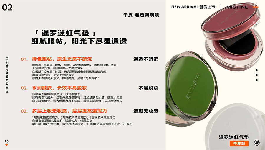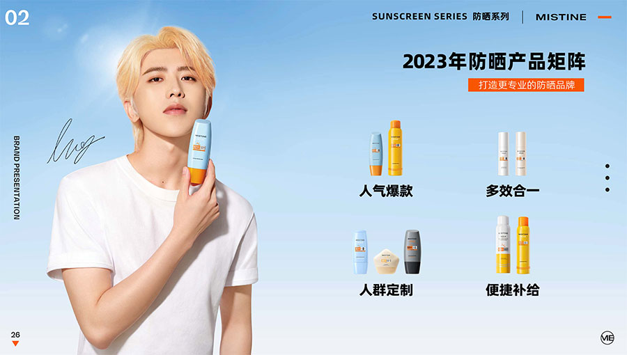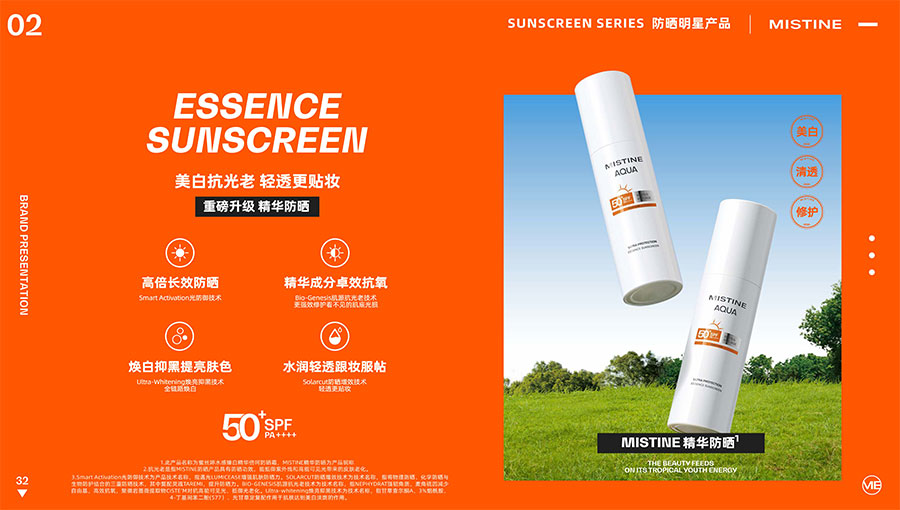 MISTINE蜜絲婷提出皮膚科學(xué)、前沿科技、靈魂成分、熱帶美學(xué)、卓越功效、保護(hù)環(huán)境六大品牌價(jià)值,致力于為全球女性提供豐富、安全、高品質(zhì)的美妝產(chǎn)品?;贛ISTINE蜜絲婷品牌首席科學(xué)顧問(wèn)——全球計(jì)算生物學(xué)權(quán)威之一、諾貝爾化學(xué)獎(jiǎng)得主Arieh Warshel的研究,MISTINE蜜絲婷創(chuàng)新防曬品類推出「光生物學(xué)」防曬系統(tǒng),提出“外層防護(hù)、中層修護(hù)和底層抗損”防曬新理念,引領(lǐng)防曬從“表面防護(hù)”進(jìn)入“深度抗光老”新時(shí)代。同時(shí),MISTINE蜜絲婷還持續(xù)深耕專業(yè)彩妝市場(chǎng),以熱帶美學(xué)基因造就產(chǎn)品防水防汗、高倍耐曬、長(zhǎng)效持妝的優(yōu)勢(shì),圍繞消費(fèi)者需求打造多元化的產(chǎn)品矩陣,引領(lǐng)防曬、底妝賽道發(fā)展。