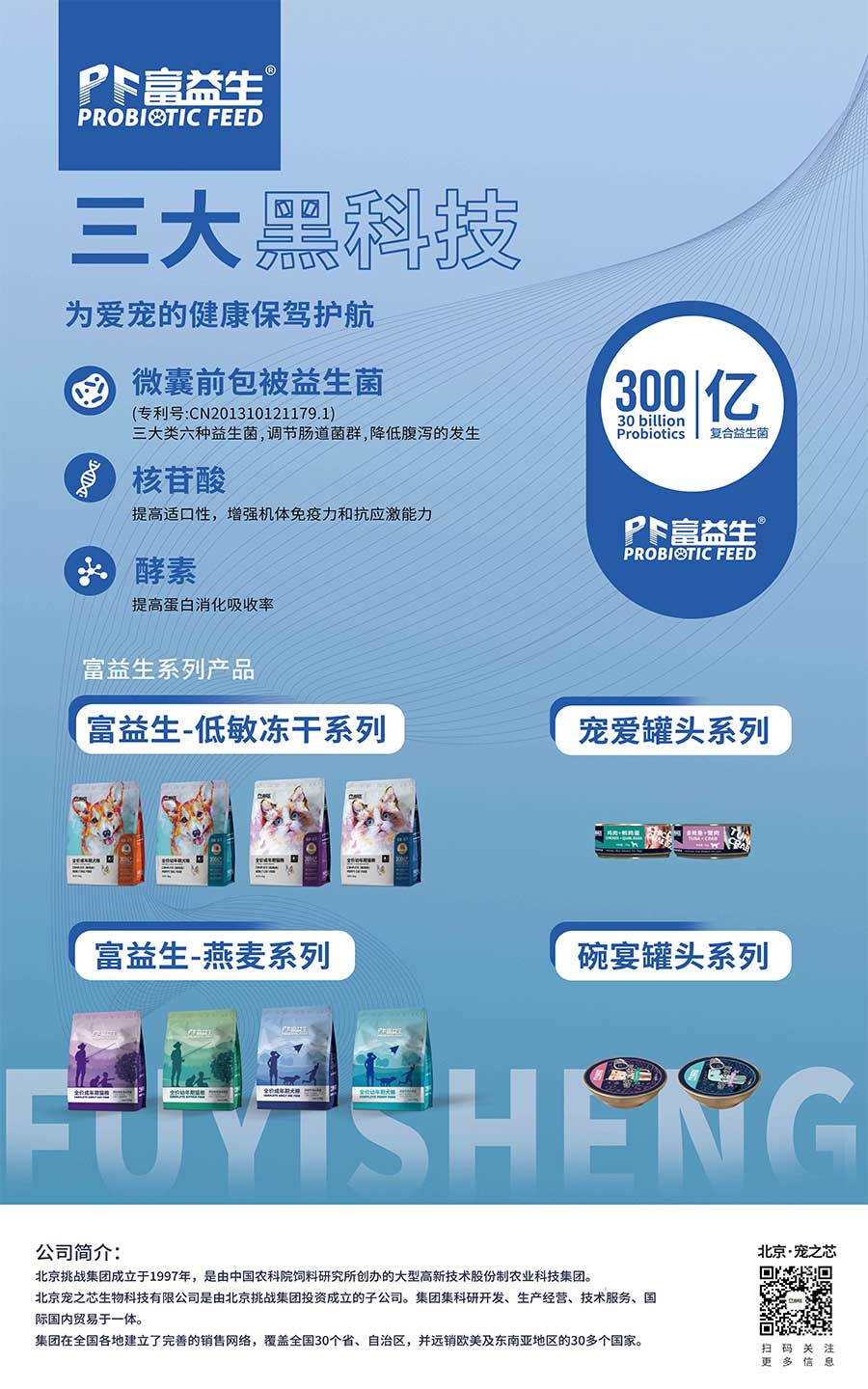 北京挑戰(zhàn)集團(tuán)將科技創(chuàng)新視為企業(yè)生命的源泉,組建挑戰(zhàn)研究院,其中博士生導(dǎo)師3人,博士14人,碩士40余人,擁有國(guó)家級(jí)“生物飼料開發(fā)國(guó)家工程研究中心”“院士專家工作站”和“企業(yè)博士后流動(dòng)站”各一個(gè)。至今獲取專利授權(quán)31件,主持承擔(dān)國(guó)家和行業(yè)研發(fā)項(xiàng)目共23項(xiàng)。挑戰(zhàn)集團(tuán)研究院院長(zhǎng)張廣民博士帶領(lǐng)寵物食品研發(fā)團(tuán)隊(duì)經(jīng)過多年的研究與試驗(yàn)成功將全價(jià)寵物干糧與多種益生菌及酶制劑完美的結(jié)合-富益生全價(jià)寵物食品。通過添加挑戰(zhàn)集團(tuán)自主產(chǎn)品“微囊前包被益生菌”“核苷酸”及酶制劑使富益生產(chǎn)品獲得了強(qiáng)大的產(chǎn)品優(yōu)勢(shì)。