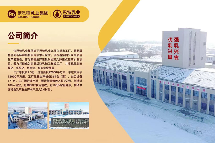 巴特乳業(yè)新疆塔城工廠是依巴特乳業(yè)集團(tuán)核心業(yè)務(wù)板塊之一,總投資1.5億,占地40余畝,承擔(dān)著高質(zhì)量生產(chǎn)的重任。地址位于新疆建設(shè)兵團(tuán)第九師白楊市巴克圖經(jīng)濟(jì)技術(shù)開發(fā)區(qū)產(chǎn)業(yè)大街1號(hào)。作為新疆生產(chǎn)建設(shè)兵團(tuán)第九師重點(diǎn)招商引資項(xiàng)目,著力打造成為世界級(jí)駝乳樣板工廠,并實(shí)現(xiàn)乳業(yè)流程化、系統(tǒng)化、數(shù)字化、智能化全覆蓋。全面投產(chǎn)后年產(chǎn)值約12億元。工廠投產(chǎn)后年產(chǎn)5000噸駱駝乳粉,年產(chǎn)全脂純生駝乳粉1500噸,年產(chǎn)駝乳配方粉1500噸;項(xiàng)目二期計(jì)劃建設(shè)常溫奶生產(chǎn)線一條,建設(shè)酸奶生產(chǎn)線一條,年產(chǎn)駱駝乳純奶1000噸;年產(chǎn)駱駝純酸奶1000噸。以滿足國(guó)內(nèi)市場(chǎng)及歐盟、中東、中非、東南亞等國(guó)家和地區(qū)出口需求。