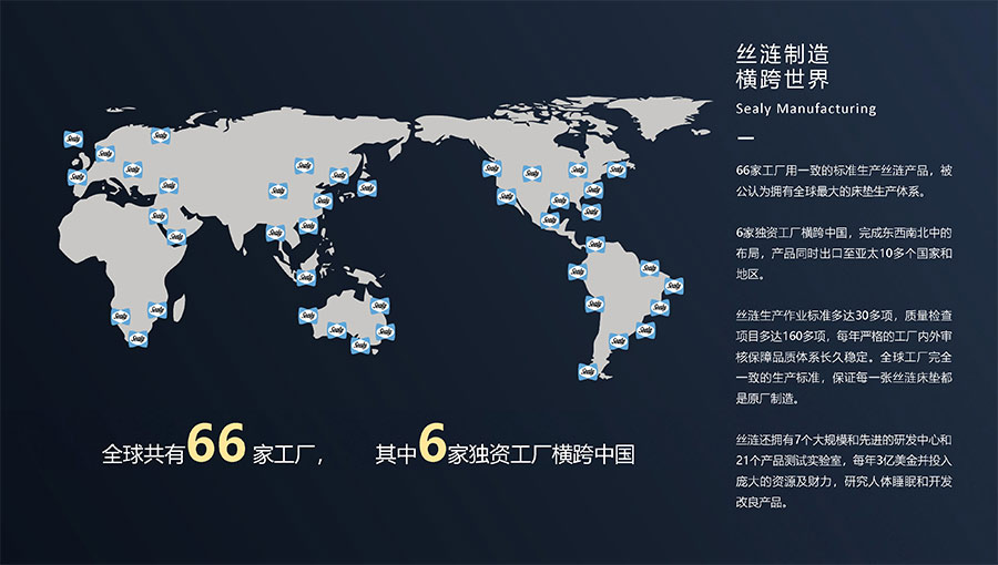 66家工廠用一致的標(biāo)準(zhǔn)生產(chǎn)絲漣產(chǎn)品,被公認(rèn)為擁有全球最大的床墊生產(chǎn)體系。
