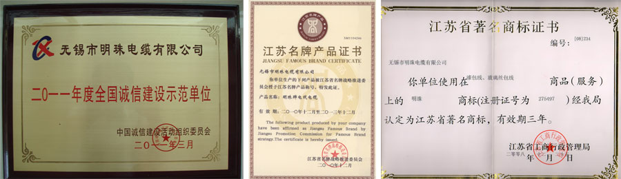 明珠電纜公司先后通過了ISO9001質(zhì)量管理體系認(rèn)證,ISO14001環(huán)境管理體系認(rèn)證,OHSAS18001職業(yè)健康安全管理體系認(rèn)證,國家強(qiáng)制性產(chǎn)品認(rèn)證(3C認(rèn)證),PCCC認(rèn)證,煤安MA認(rèn)證和全國工業(yè)產(chǎn)品生產(chǎn)許可證等認(rèn)證。“明珠”以優(yōu)質(zhì)品牌形象和優(yōu)秀的企業(yè)文化著稱于行業(yè)。“明珠牌”電線電纜產(chǎn)品先后被認(rèn)定為“全國用戶滿意產(chǎn)品”、“高新技術(shù)產(chǎn)品”、“江蘇省名牌產(chǎn)品”、“江蘇省用戶滿意產(chǎn)品”、“江蘇省市場抽檢合格產(chǎn)品”、“無錫市重點(diǎn)保護(hù)產(chǎn)品”等;“明珠”商標(biāo)被評為“江蘇省著名商標(biāo)”;明珠電纜公司先后榮獲“全國用戶滿意企業(yè)”、“全國重合同守信用企業(yè)”、“資信等級AAA企業(yè)”、“產(chǎn)品質(zhì)量信得過企業(yè)”等榮譽(yù)稱號。