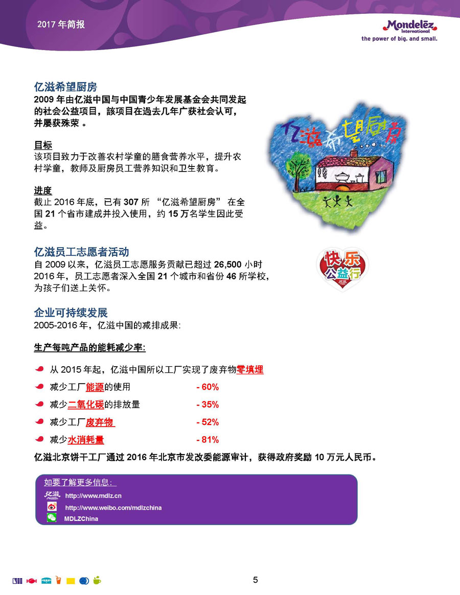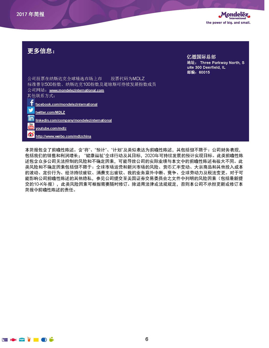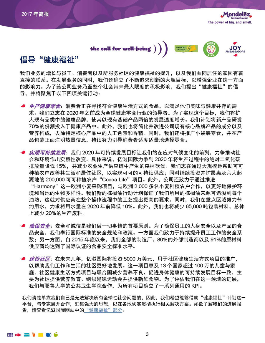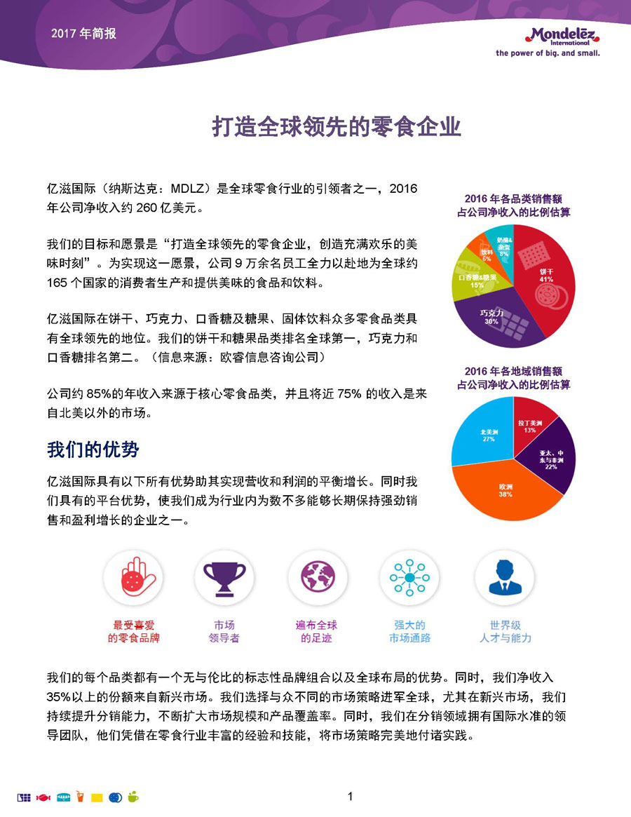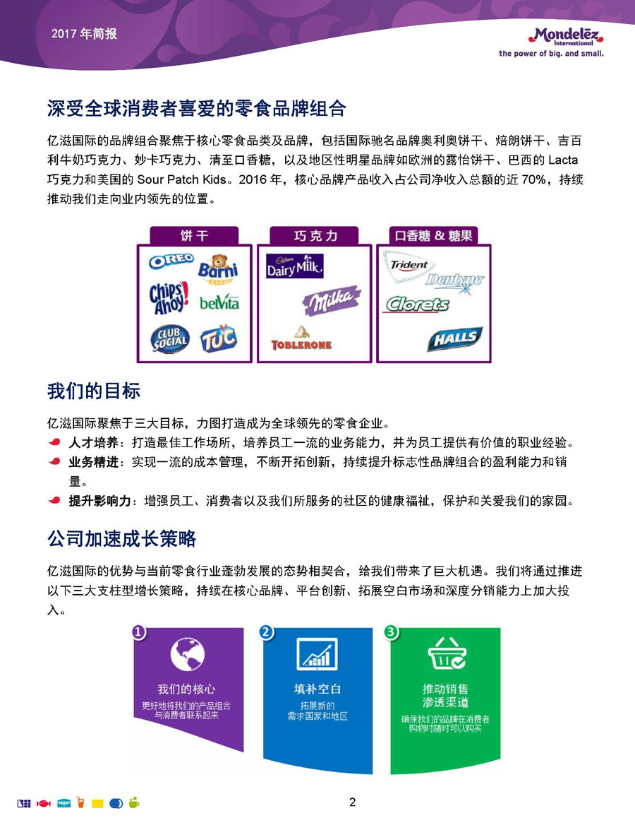 我們的目標和愿景是:打造全球領先的零食企業(yè),創(chuàng)造充滿歡樂的美味時刻。為實現(xiàn)這一愿景,公司9萬余名員工全力以赴地為全球約165個國家的消費者生產和提供美味的食品和飲料。