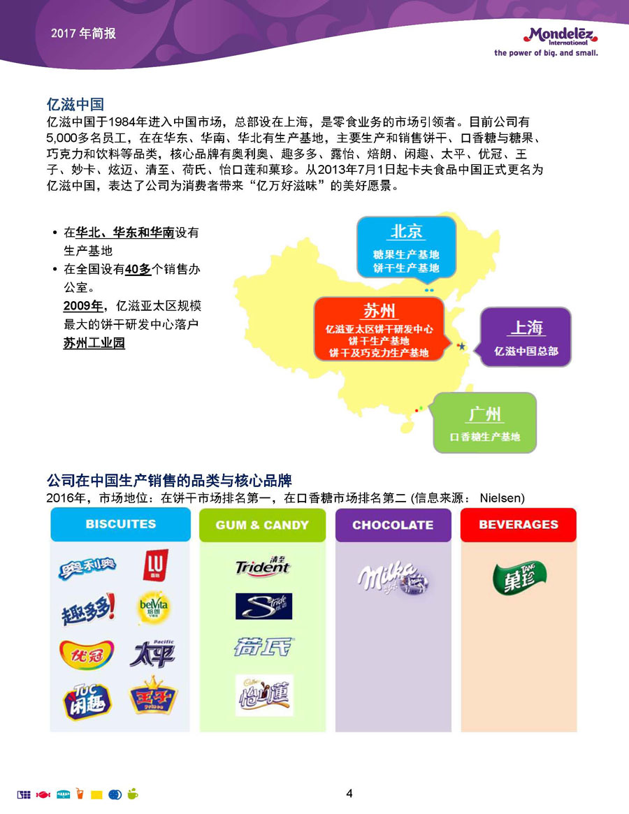 億滋中國于1984年進入中國市場,總部設在上海,是零食業(yè)務的市場引領者。目前公司有5000多名員工,在華東、華南、華北有生產基地,主要生產和銷售餅干、口香糖與糖果、巧克力和飲料等品類,核心品牌有奧利奧、趣多多、露怡、焙朗、閑趣、太平、優(yōu)冠、王子、妙卡、炫邁、清至、荷氏、怡口蓮和菓珍。從2013年7月1日起卡夫食品中國正式更名為億滋中國,表達了公司為消費者帶來“億萬好滋味”的美好愿景。