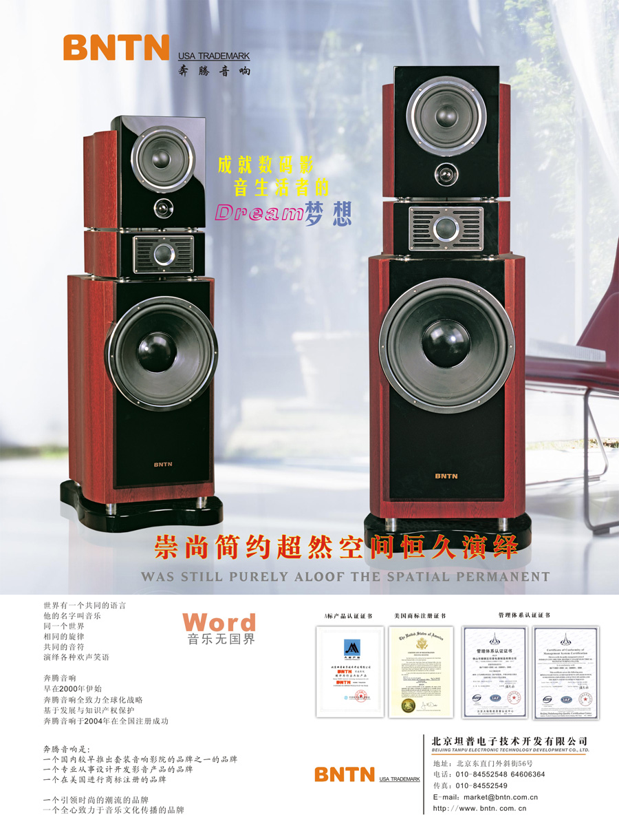 北京坦普電子技術(shù)開發(fā)有限公司是一家專業(yè)從事家庭影院設(shè)計(jì)、開發(fā)、銷售的公司,其主打品牌BNTN奔騰音響(中國(guó)中文注冊(cè)“萬(wàn)馬奔騰”)是國(guó)內(nèi)較早推出套裝音響影院的品牌之一。
