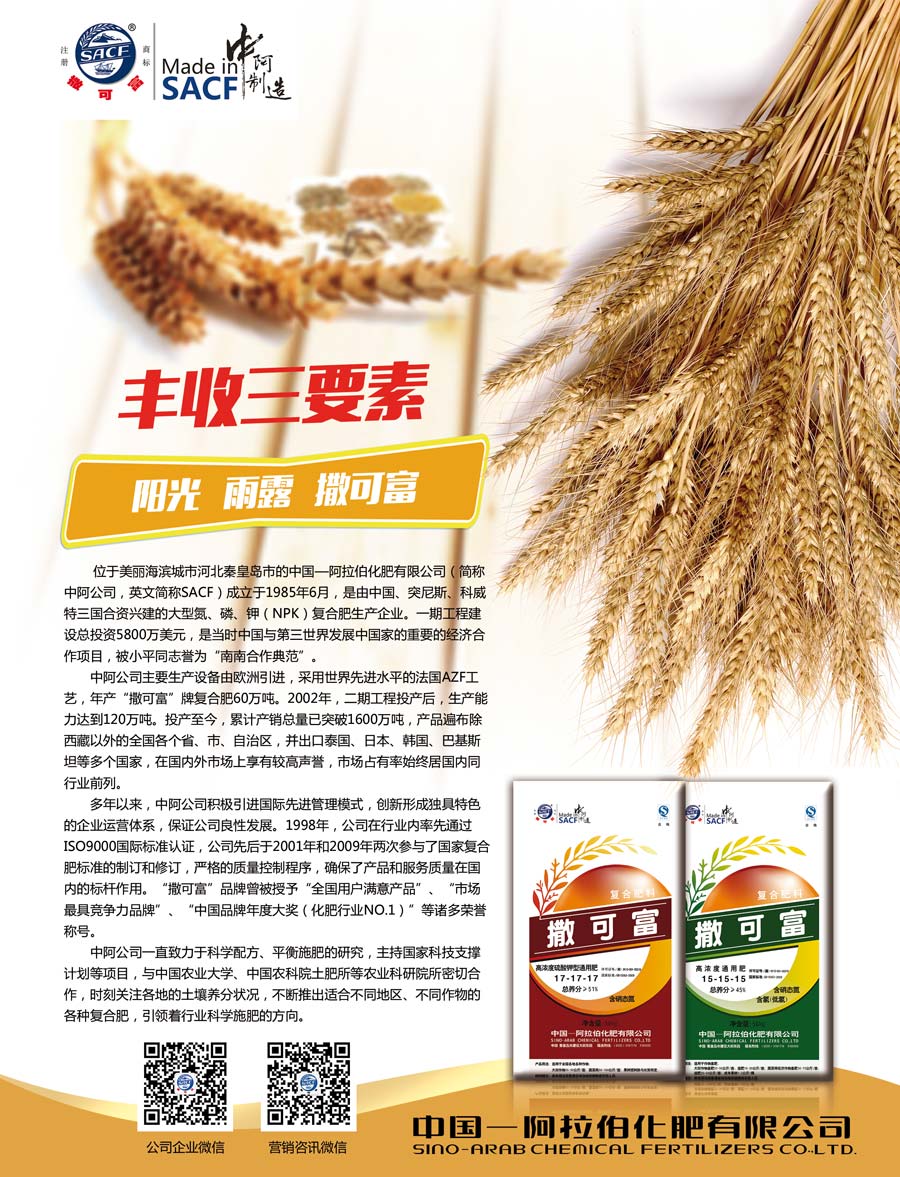 多年以來,中阿公司積極引進(jìn)國際先進(jìn)管理模式,創(chuàng)新形成獨具特色的企業(yè)運營體系,保證公司良性發(fā)展。1998年,公司在行業(yè)內(nèi)率先通過ISO9000國際標(biāo)準(zhǔn)認(rèn)證,公司先后于2001年和2009年二次參與了國家復(fù)合肥標(biāo)準(zhǔn)的制訂和修訂,嚴(yán)格的質(zhì)量控制程序,確保了產(chǎn)品和服務(wù)質(zhì)量在國內(nèi)的標(biāo)桿作用。“撒可富”品牌曾被授予“全國用戶滿意產(chǎn)品”、“市場最具競爭力品牌”、“中國品牌年度大獎(化肥行業(yè)NO.1)”等諸多榮譽(yù)稱號。
