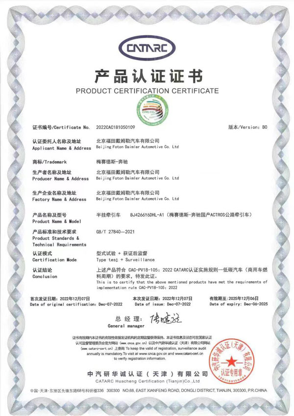 梅賽德斯-奔馳國(guó)產(chǎn)重卡Actros 6×4公路牽引車(chē)獲“低碳汽車(chē)(商用車(chē)燃料周期)”認(rèn)證證書(shū)