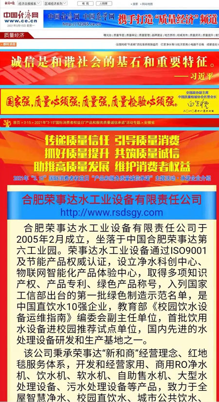作為凈水行業(yè)領(lǐng)軍企業(yè),榮事達(dá)積極響應(yīng)中國質(zhì)量檢驗(yàn)協(xié)會“產(chǎn)品和服務(wù)質(zhì)量誠信承諾”號召,面向廣大用戶做出相關(guān)產(chǎn)品和服務(wù)質(zhì)量誠信承諾,體現(xiàn)了企業(yè)應(yīng)有的社會責(zé)任和擔(dān)當(dāng)。榮事達(dá)從中脫穎而出,一舉獲得“全國產(chǎn)品和服務(wù)質(zhì)量誠信示范企業(yè)”“全國質(zhì)量信得過產(chǎn)品”“全國凈水行業(yè)質(zhì)量領(lǐng)先品牌”“全國質(zhì)量誠信先進(jìn)企業(yè)”四項(xiàng)殊榮,相關(guān)承諾和獲獎(jiǎng)情況已在中國質(zhì)量網(wǎng)、中國經(jīng)濟(jì)網(wǎng)、中國消費(fèi)網(wǎng)在線發(fā)布。該項(xiàng)活動(dòng)也得到人民網(wǎng)、新華網(wǎng)、央視網(wǎng)、搜狐網(wǎng)等主流網(wǎng)絡(luò)媒體的報(bào)道。