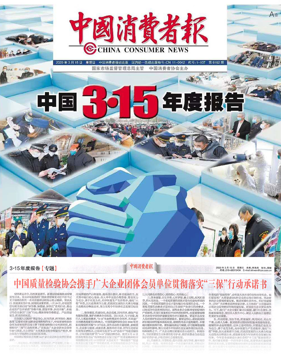 中國消費網(wǎng)《不忘初心 勇毅擔當 守望相助 傳遞信任——中國質量檢驗協(xié)會攜廣大會員企業(yè)響應“三保”行動并組織開展2020年3·15產(chǎn)品和服務質量誠信活動》