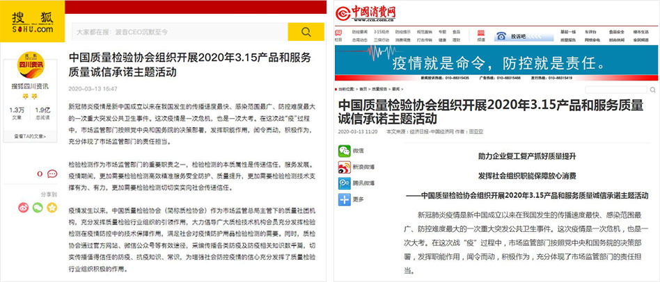 搜狐網(wǎng)《中國質量檢驗協(xié)會組織開展2020年3.15產(chǎn)品和服務質量誠信承諾主題活動》