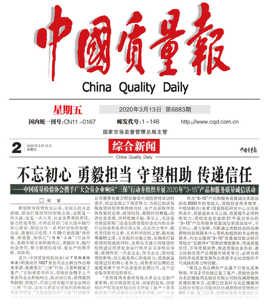 中國質量報《不忘初心 勇毅擔當 守望相助 傳遞信任——中國質量檢驗協(xié)會攜手廣大會員企業(yè)響應“三?!毙袆硬⒔M織開展2020年“3·15”產(chǎn)品和服務質量誠信活動》