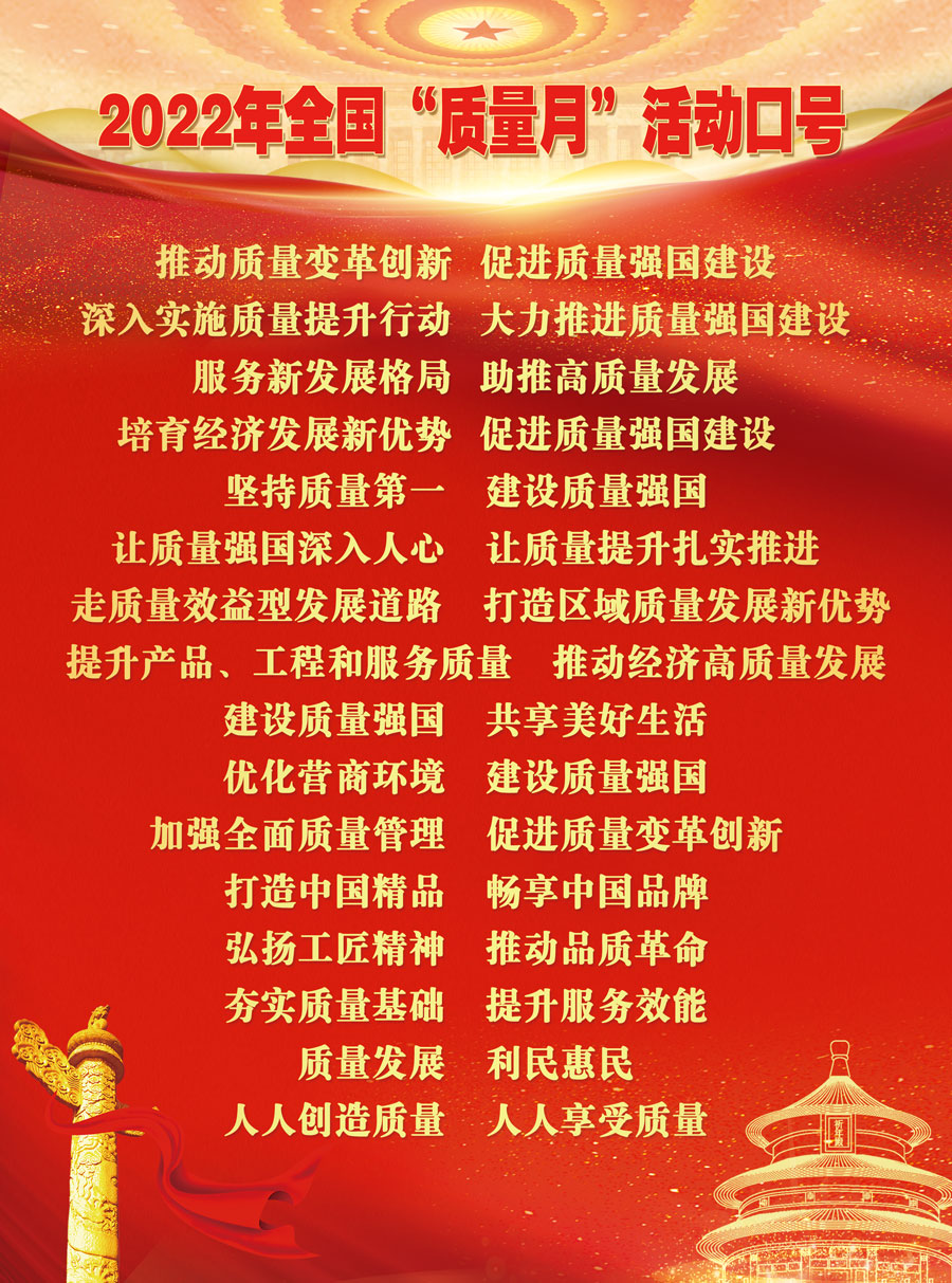 為深入貫徹習(xí)近平新時代中國特色社會主義思想,全面落實(shí)黨的十九大和十九屆歷次全會精神,立足新發(fā)展階段,完整、準(zhǔn)確、全面貫徹新發(fā)展理念,構(gòu)建新發(fā)展格局,樹立質(zhì)量第一的強(qiáng)烈意識,大力提升各行業(yè)質(zhì)量水平,推動經(jīng)濟(jì)加快發(fā)展,促進(jìn)質(zhì)量強(qiáng)國建設(shè),以實(shí)際行動迎接黨的二十大勝利召開,市場監(jiān)管總局等21個部門定于2022年9月聯(lián)合開展以“推動質(zhì)量變革創(chuàng)新 促進(jìn)質(zhì)量強(qiáng)國建設(shè)”為主題的2022年全國“質(zhì)量月”活動。